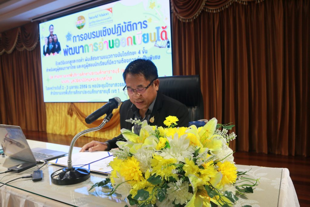 วันที่ 2 เมษายน 2569 เวลา 08.45 น. ณ หอประชุมปักษาสวรรค์ ดร.บรรเจิด อุ่นมณีรัตน์ ผู้อำนวยการสำนักงานเขตพื้นที่การศึกษาประถมศึกษาราชบุรี เขต 1 มอบหมายให้ นายสมัคร โสระมรรค รองผู้อำนวยการสำนักงานเขตพื้นที่การศึกษาประถมศึกษาราชบุรี เขต 1 เป็นประธานเปิดการอบรบเชิงปฏิบัติการพัฒนาการอ่านออกเขียนได้ ด้วยวิธีแจกลูกสะกดคำ ผันเสียงตามแนวทางบันไดทักษะ 4 ขั้น สำหรับครูผู้สอนนักเรียนที่มีความต้องการจำเป็นพิเศษ โดยสำนักงานเขตพื้นที่การศึกษาประถมศึกษาราชบุรี เขต 1 ร่วมกับ มูลนิธิศุภนิมิตแห่งประเทศไทย ในระหว่างวันที่ 2 – 3 เมษายน 2569 วิทยากรให้ความรู้คือ “ครูก้อย” ในดวงตา ปทุมสูติ ซึ่งมีความรู้และความเชี่ยวชาญในการสอนภาษาไทย เพื่อแก้ไขปัญหาเด็กอ่านไม่ออก เขียนไม่ได้ทั้งในเชิงทฤษฎีและในการฝึกปฏิบัติจริง ผู้เข้าอบรมประกอบด้วย ผู้อำนวยการโรงเรียนอนุบาลปากท่อ ครูผู้สอนจากโรงเรียนสังกัดสำนักงานเขตพื้นที่การศึกษาประถมศึกษาราชบุรี เขต 1 ศูนย์การศึกษาพิเศษประจำจังหวัดราชบุรี และหน่วยงานอื่น รวมจำนวนทั้งสิ้น 143 คน วัตถุประสงค์เพื่อพัฒนาทักษะความรู้ความเข้าใจของครูผู้สอนชั้นประถมศึกษาปีที่ 1 ในการสอนอ่านแบบแจกลูกสะกดคำ เพื่อนำทักษะบันได 4 ขั้น ไปปรับใช้ในห้องเรียนได้อย่างมีประสิทธิภาพ เพื่อยกระดับผลสัมฤทธิ์ด้านการอ่านออกเขียนได้ของนักเรียนให้เป็นไปตามเกณฑ์มาตรฐาน ทั้งนี้มูลนิธิศุภนิมิตแห่งประเทศไทย ให้การสนับสนุนวัสดุ อุปกรณ์ สำหรับครูผู้สอนนำไปจัดสื่อการสอนในโรงเรียน