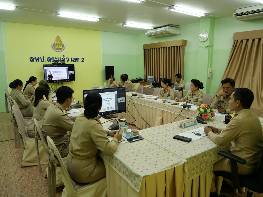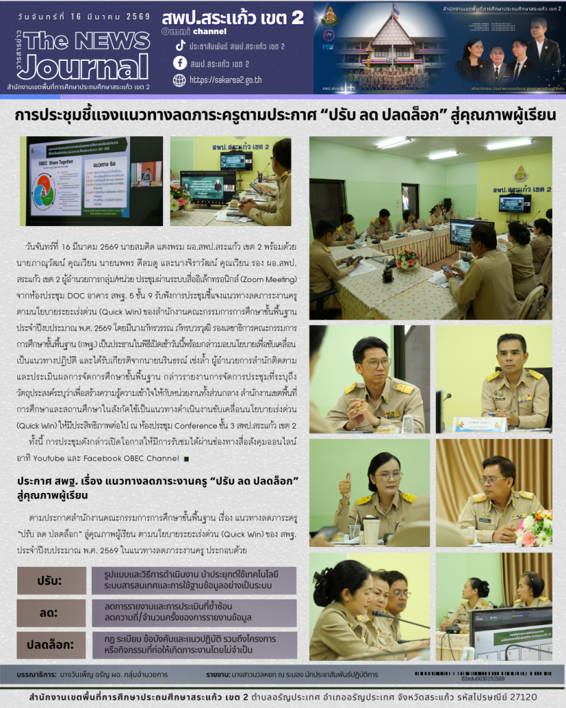 วันจันทร์ที่ 16 มีนาคม 2569 นายสมคิด แตงพรม ผอ.สพป.สระแก้ว เขต 2 พร้อมด้วย นายภาณุวัฒน์ คุณเวียน นายนพพร ดีสมดู และนางจิราวัฒน์ คุณเวียน รอง ผอ.สพป.สระแก้ว เขต 2 ผู้อำนวยการกลุ่ม/หน่วย ประชุมผ่านระบบสื่ออิเล็กทรอนิกส์ (Zoom Meeting) จากห้องประชุม DOC อาคาร สพฐ. 5 ชั้น 9 รับฟังการประชุมชี้แจงแนวทางลดภาระงานครูตามนโยบายระยะเร่งด่วน (Quick Win) ของสำนักงานคณะกรรมการการศึกษาขั้นพื้นฐาน ประจำปีงบประมาณ พ.ศ. 2569 โดยมี นางภัทรวรรณ ภัทรบวรวุฒิ รองเลขาธิการคณะกรรมการการศึกษาขั้นพื้นฐาน (กพฐ.) เป็นประธานในพิธีเปิดเช้าวันนี้ พร้อมกล่าวมอบนโยบายเพื่อขับเคลื่อนเป็นแนวทางปฏิบัติและได้รับเกียรติจาก นายนรินธรณ์ เซ่งล้ำ ผู้อำนวยการสำนักติดตามและประเมินผลการจัดการศึกษาขั้นพื้นฐาน กล่าวรายงานการจัดการประชุมที่ระบุถึงวัตถุประสงค์ระบุว่าเพื่อสร้างความรู้ความเข้าใจให้กับหน่วยงานทั้งส่วนกลาง สำนักงานเขตพื้นที่การศึกษาและสถานศึกษาในสังกัดใช้เป็นแนวทางดำเนินงานขับเคลื่อนนโยบายเร่งด่วน (Quick Win) ให้มีประสิทธิภาพต่อไป ณ ห้องประชุม Conference ชั้น 3 สพป.สระแก้ว เขต 2