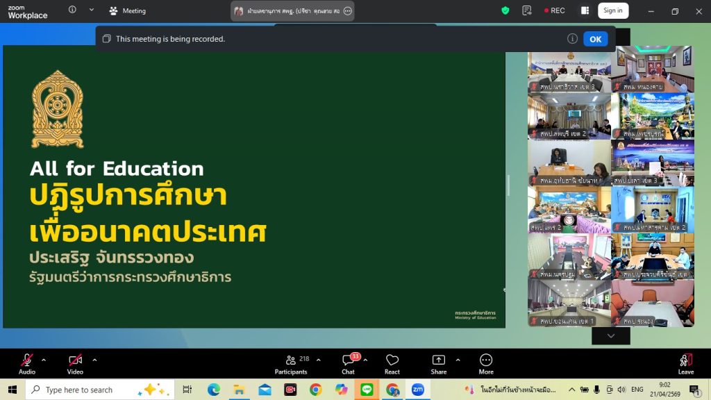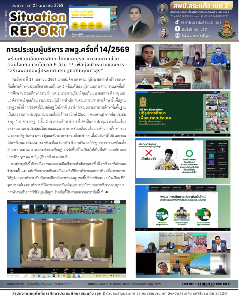 วันอังคารที่ 21 เมษายน 2569 นายสมคิด แตงพรม ผู้อำนวยการสำนักงานเขตพื้นที่การศึกษาประถมศึกษาสระแก้ว เขต 2 พร้อมด้วยรองผู้อำนวยการสำนักงานเขตพื้นที่การศึกษาประถมศึกษาสระแก้ว เขต 2 นายภาณุวัฒน์ คุณเวียน นายนพพร ดีสมดู และนางจิราวัฒน์ คุณเวียน ร่วมประชุมผู้บริหารสำนักงานคณะกรรมการการศึกษาขั้นพื้นฐาน (สพฐ.) ครั้งที่ 14/2569 ที่มีนายพิเชฐ โพธิ์ภักดี เลขาธิการคณะกรรมการการศึกษาขั้นพื้นฐาน เป็นประธานการประชุมผ่านระบบสื่ออิเล็กทรอนิกส์ (Zoom Meeting) จากห้องประชุม สพฐ. 1 อาคาร สพฐ. 4 ชั้น 2 กระทรวงศึกษาธิการ ซึ่งจัดเป็นการประชุมวาระเชื่อมโยงและทบทวนการประชุมนโยบายและแนวทางการขับเคลื่อนนโยบายด้านการศึกษา ของ นายประเสริฐ จันทรรวงทอง รัฐมนตรีว่าการกระทรวงศึกษาธิการ เมื่อวันจันทร์ที่ 20 เมษายน 2569 ที่ผ่านมา ถึงแนวทางการขับเคลื่อน 5 ภารกิจ คือ การคืนเวลาให้ครู การลดความเหลื่อมล้ำด้านงบประมาณ การยกระดับการเรียนรู้ การจัดพื้นที่โรงเรียนให้เป็นพื้นที่ปลอดภัย และการปรับปรุงพระราชบัญญัติการศึกษาแห่งชาติ