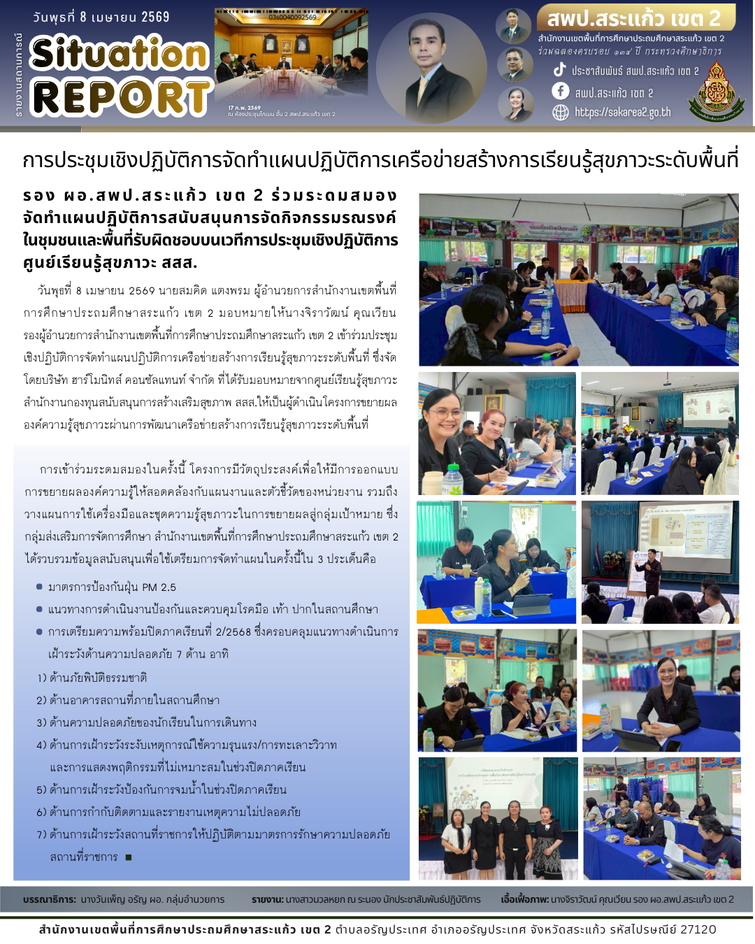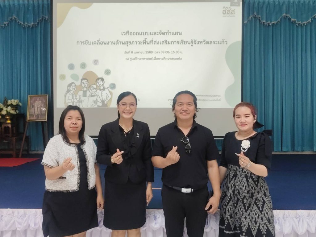 วันพุธที่ 8 เมษายน 2569 นายสมคิด แตงพรม ผู้อำนวยการสำนักงานเขตพื้นที่การศึกษาประถมศึกษาสระแก้ว เขต 2 มอบหมายให้ นางจิราวัฒน์ คุณเวียน รองผู้อำนวยการสำนักงานเขตพื้นที่การศึกษาประถมศึกษาสระแก้ว เขต 2 เข้าร่วมประชุมเชิงปฏิบัติการจัดทำแผนปฏิบัติการเครือข่ายสร้างการเรียนรู้สุขภาวะระดับพื้นที่ ซึ่งจัดโดยบริษัท ฮาร์โมนิทส์ คอนซัลแทนท์ จำกัด ที่ได้รับมอบหมายจาก ศูนย์เรียนรู้สุขภาวะสำนักงานกองทุนสนับสนุนการสร้างเสริมสุขภาพ สสส. ให้เป็นผู้ดำเนินโครงการขยายผลองค์ความรู้สุขภาวะผ่านการพัฒนาเครือข่ายสร้างการเรียนรู้สุขภาวะระดับพื้นที่