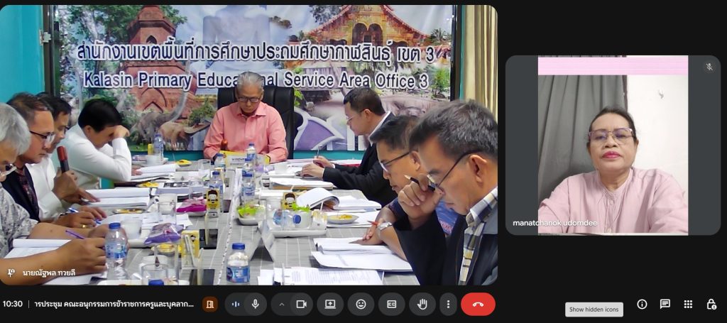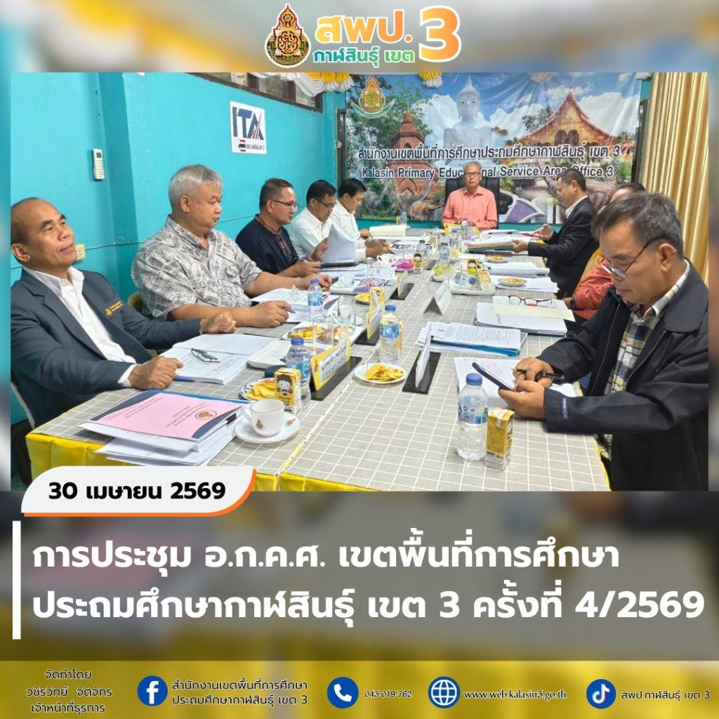 วันพฤหัสบดีที่ 30 เมษายน 2569 เวลา 09.30 น. นายสุนทรา หันชัยศรี ผู้ทรงคุณวุฒิด้านการบริหารงานบุคคล ปฏิบัติหน้าที่แทน ประธาน อ.ก.ค.ศ. เขตพื้นที่การศึกษาประถมศึกษากาฬสินธุ์ เขต 3 ในการประชุม อ.ก.ค.ศ. เขตพื้นที่การศึกษาประถมศึกษากาฬสินธุ์ เขต 3 ครั้งที่ 4/2569 เพื่อพิจารณาวาระการประชุมเกี่ยวกับการบริหารงานบุคคล ในการประชุมครั้งนี้ นายภมร หลอดแพง ผอ. สพป.กาฬสินธุ์ เขต 3 อนุกรรมการ และเลขานุการ ผู้แทน ผู้ทรงวุฒิ อนุกรรมการ และผู้เกี่ยวข้อง เข้าร่วมการประชุมอย่างพร้อมเพรียง เพื่อให้การบริหารงานบุคคลเป็นไปโดยสุจริต เที่ยงธรรม ตามหลักธรรมาภิบาล ณ ห้องประชุม อ.ก.ค.ศ. สพป.กาฬสินธุ์ เขต 3