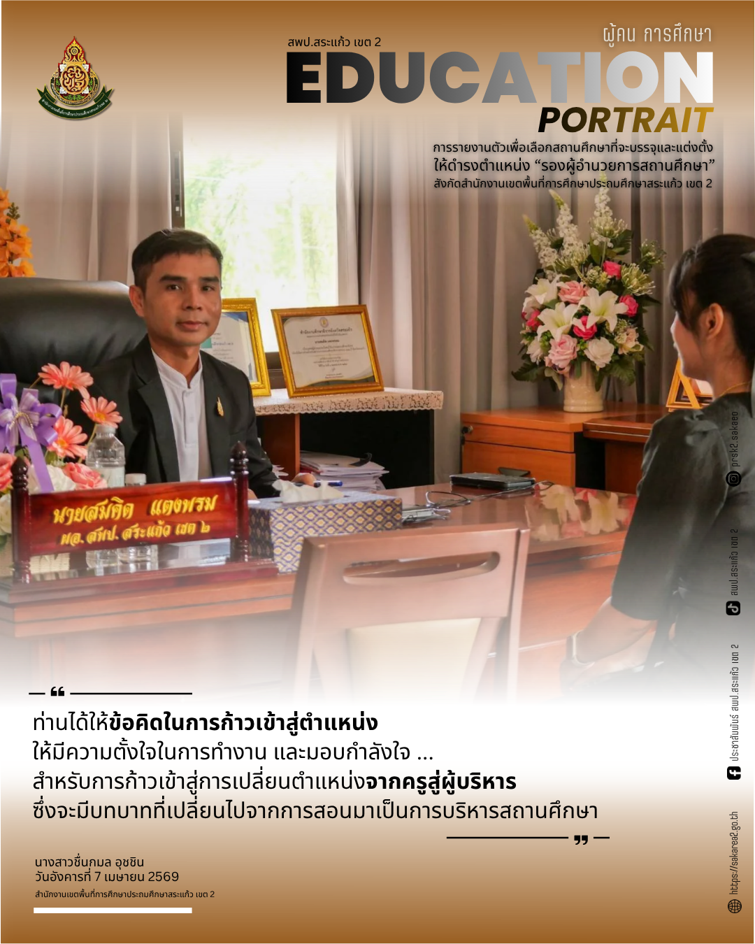 นางสาวชื่นกมล อุชชิน เข้ารับโอวาทและคำแนะนำที่เป็นประโยชน์ต่อการนำไปประยุกต์ใช้งานจาก นายสมคิด แตงพรม ผู้อำนวยการสำนักงานเขตพื้นที่การศึกษาประถมศึกษาสระแก้ว เขต 2 ในโอกาสเข้ารับการรายงานตัวเพื่อเลือกสถานศึกษาที่จะบรรจุและแต่งตั้ง เมื่อเช้าวันอังคารที่ 7 เมษายน 2569 กับการดำรงตำแหน่งรองผู้อำนวยการโรงเรียนบ้านเขาพรมสุวรรณ ซึ่งตั้งอยู่ ณ อำเภอวัฒนานคร จังหวัดสระแก้ว และเป็นหนึ่งโรงเรียนในสังกัดสำนักงานเขตพื้นที่การศึกษาประถมศึกษาสระแก้ว เขต 2