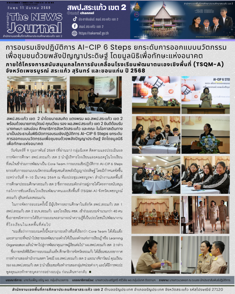 วันจันทร์ที่ 9 กุมภาพันธ์ 2569 (ที่ผ่านมา) กลุ่มนิเทศ ติดตามและประเมินผลการจัดการศึกษา สพป.สระแก้ว เขต 2 นำผู้บริหารโรงเรียนและคณะครูในโรงเรียนที่สนใจเข้าร่วมการพัฒนาเป็น Core Team การอบรมเชิงปฏิบัติการ AI-CIP 6 Steps ยกระดับการออกแบบนวัตกรรมเพื่อชุมชนด้วยพลังปัญญาประดิษฐ์ โดยมีกำหนดจัดขึ้นระหว่างวันที่ 9-10 มีนาคม 2569 ณ ห้องประชุมเพชรบูรพา สำนักงานเขตพื้นที่การศึกษาประถมศึกษาสระแก้ว เขต 2 ซึ่งการอบรมดังกล่าวอยู่ภายใต้โครงการสนับสนุนกลไกการขับเคลื่อนโรงเรียนพัฒนาตนเองเชิงพื้นที่ (TSQM-A) จังหวัดเพชรบูรณ์ สระแก้ว สุรินทร์และขอนแก่น