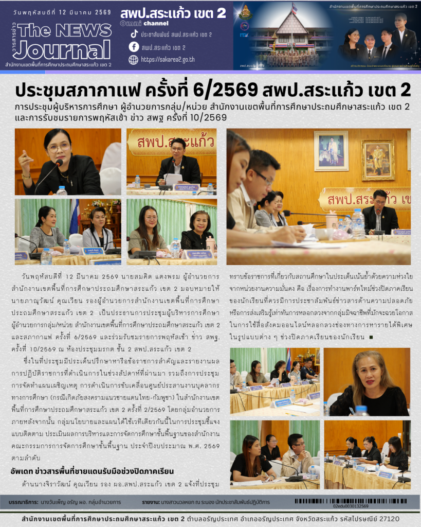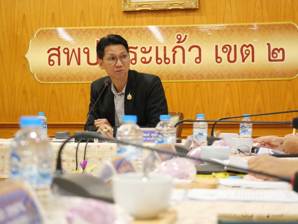 วันพฤหัสบดีที่ 12 มีนาคม 2569 นายสมคิด แตงพรม ผู้อำนวยการสำนักงานเขตพื้นที่การศึกษาประถมศึกษาสระแก้ว เขต 2 มอบหมายให้นายภาณุวัฒน์ คุณเวียน รองผู้อำนวยการสำนักงานเขตพื้นที่การศึกษาประถมศึกษาสระแก้ว เขต 2 เป็นประธานการประชุมผู้บริหารการศึกษา ผู้อำนวยการกลุ่ม/หน่วย สำนักงานเขตพื้นที่การศึกษาประถมศึกษาสระแก้ว เขต 2 และสภากาแฟ ครั้งที่ 6/2569 และร่วมรับชมรายการพฤหัสเช้า ข่าว สพฐ. ครั้งที่ 10/2569 ณ ห้องประชุมมรกต ชั้น 2 สพป.สระแก้ว เขต 2