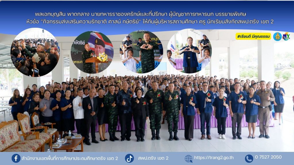 วันที่ 10 มีนาคม 2569 สำนักงานเขตพื้นที่การศึกษา (สพป.ตรัง เขต 2) ร่วมกับโครงการโรงเรียนคำพ่อสอน สำนักงานเครือข่ายงดเหล้า (สคล.) สำนักงานกองทุนสนับสนุนการสร้างเสริมสุขภาพ (สสส.) จัดกิจกรรมเปิดบ้านห้องเรียนโรงเรียนคำพ่อสอน มีนางสาวปัญจศีล ภูสงัด ผอ.สพป.ตรัง เขต 2 พร้อมทีมบริหาร สพป.ตรัง เขต 2 นายณัฐวุฒิ สังข์สุข นายอำเภอห้วยยอด พ.ต.อ.สานิตย์ พลเพชร ผกก.สภ.ห้วยยอด เข้าร่วม พร้อมกลุ่มเป้าหมายคือ ผู้บริหารสถานศึกษา ครูผู้สอน และนักเรียน ของโรงเรียนในสังกัด สพป.ตรัง เขต 2 สพป.ชุมพร เขต 2 สพป.สมุทรสาคร สพป.สงขลา เขต 3 จำนวน 500 คน