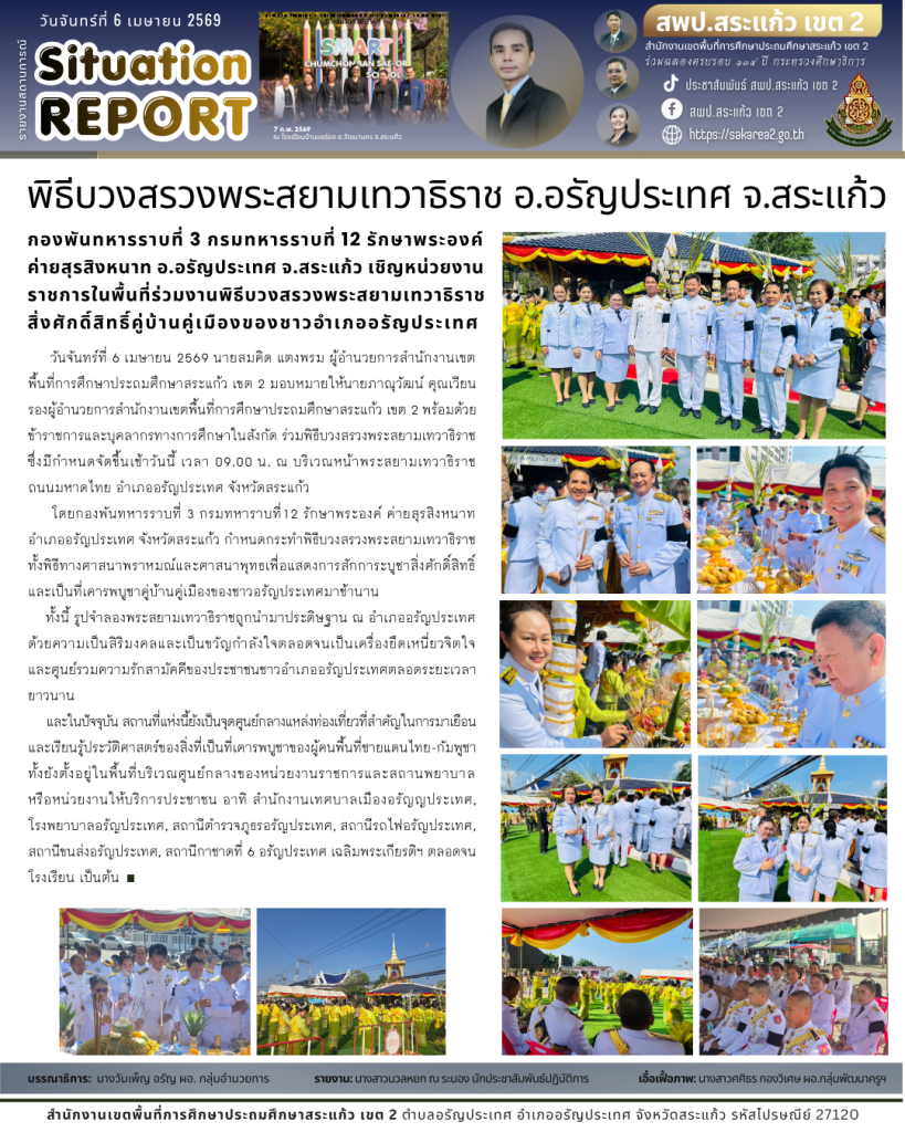 วันจันทร์ที่ 6 เมษายน 2569 นายสมคิด แตงพรม ผู้อำนวยการสำนักงานเขตพื้นที่การศึกษาประถมศึกษาสระแก้ว เขต 2 มอบหมายให้นายภาณุวัฒน์ คุณเวียน รองผู้อำนวยการสำนักงานเขตพื้นที่การศึกษาประถมศึกษาสระแก้ว เขต 2 พร้อมด้วยข้าราชการและบุคลากรทางการศึกษาในสังกัด ร่วมพิธีบวงสรวงพระสยามเทวาธิราช ซึ่งมีกำหนดจัดขึ้นเช้าวันนี้ เวลา 09.00 น. ณ บริเวณหน้าพระสยามเทวาธิราช ถนนมหาดไทย อำเภออรัญประเทศ จังหวัดสระแก้ว