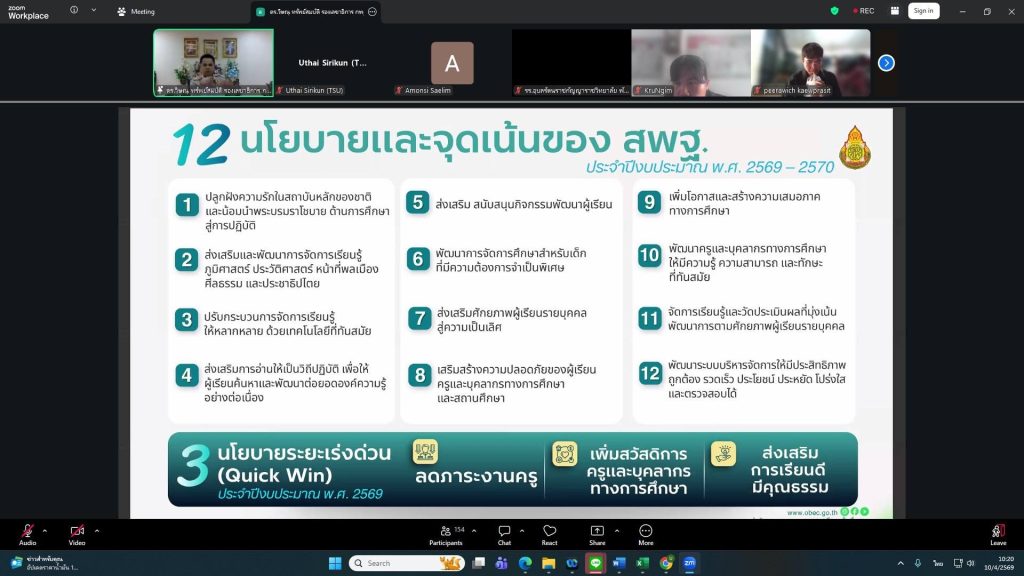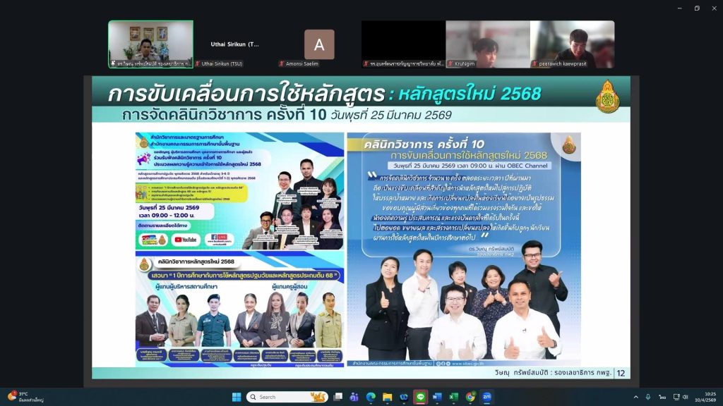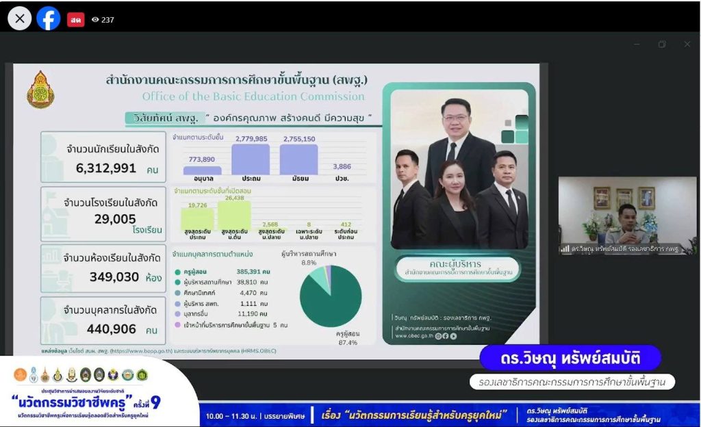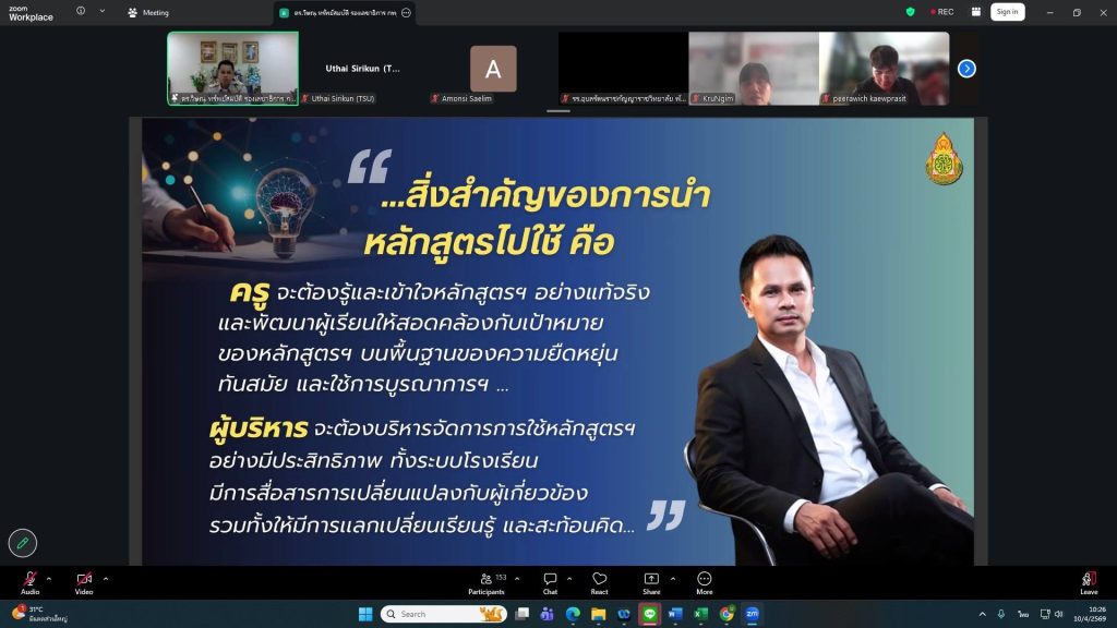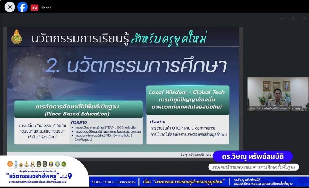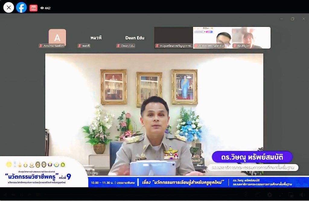 วันที่ 10 เมษายน 2569 นายวิษณุ ทรัพย์สมบัติ รองเลขาธิการคณะกรรมการการศึกษาขั้นพื้นฐาน (รองเลขาธิการ กพฐ.) ได้รับเชิญเป็นวิทยากรบรรยายพิเศษในหัวข้อ “นวัตกรรมการเรียนรู้สำหรับครูยุคใหม่” ผ่านระบบออนไลน์ ภายในโครงการประชุมวิชาการและนำเสนอผลงานวิจัยระดับชาติ “นวัตกรรมวิชาชีพครู” ครั้งที่ 9 ซึ่งจัดโดยคณะศึกษาศาสตร์ มหาวิทยาลัยทักษิณ ร่วมกับสถาบันผลิตครูภาคใต้ตอนล่าง ณ จังหวัดสงขลา