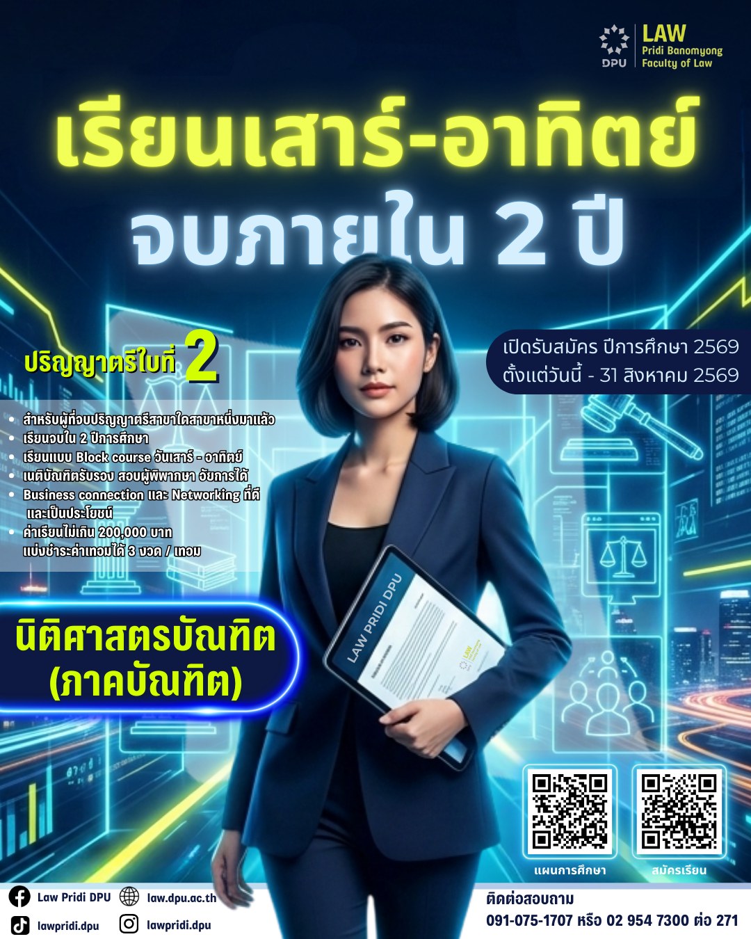 คณะนิติศาสตร์ปรีดี พนมยงค์ มหาวิทยาลัยธุรกิจบัณฑิตย์ เปิดรับสมัครเข้าศึกษาในหลักสูตรนิติศาสตรบัณฑิต (ภาคบัณฑิต) ประจำปีการศึกษา 2569 ตั้งแต่วันนี้จนถึงวันที่ 31 สิงหาคม 2569 ทั้งนี้ สามารถศึกษารายละเอียดเพิ่มเติมได้ที่ลิงก์ https://get-qr.com/LUBdEg และสมัครเข้าศึกษาในหลักสูตรดังกล่าวได้ที่ลิงก์ https://get-qr.com/qYO506