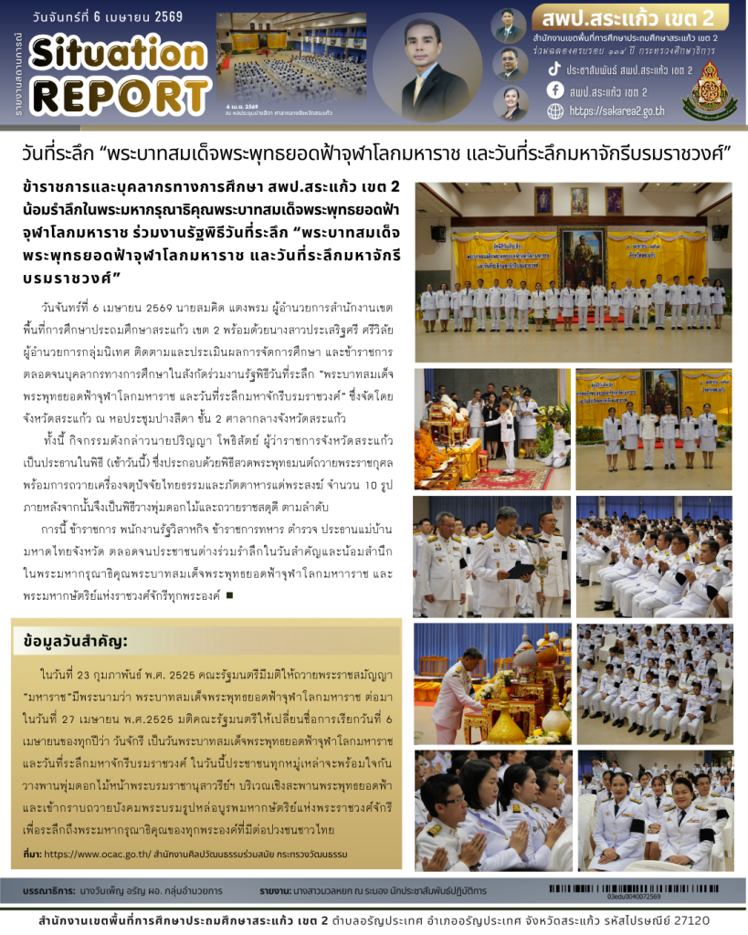 วันจันทร์ที่ 6 เมษายน 2569 นายสมคิด แตงพรม ผู้อำนวยการสำนักงานเขตพื้นที่การศึกษาประถมศึกษาสระแก้ว เขต 2 พร้อมด้วยนางสาวประเสริฐศรี ศรีวิลัย ผู้อำนวยการกลุ่มนิเทศ ติดตามและประเมินผลการจัดการศึกษา และข้าราชการตลอดจนบุคลากรทางการศึกษาในสังกัดร่วมงานรัฐพิธีวันที่ระลึก “พระบาทสมเด็จพระพุทธยอดฟ้าจุฬาโลกมหาราช และวันที่ระลึกมหาจักรีบรมราชวงศ์” ซึ่งจัดโดยจังหวัดสระแก้ว ณ หอประชุมปางสีดา ชั้น 2 ศาลากลางจังหวัดสระแก้ว