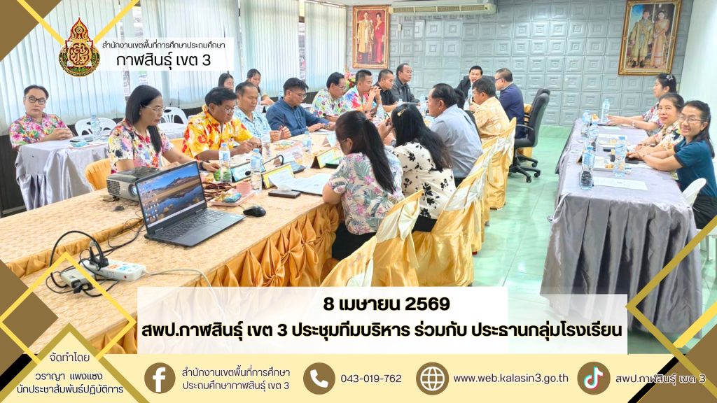วันพุธที่ 8 เมษายน 2569 เวลา 09.00 น. นายภมร หลอดแพง ผอ. สพป.กาฬสินธุ์ เขต 3 เป็นประธานในการประชุมทีมบริหาร พร้อมด้วย นายชัยณรงค์ ฤทธิ์วงค์ นายทรงวุฒิ ศรล้อม รอง ผอ. สพป.กาฬสินธุ์ เขต 3 ผอ.กลุ่ม/หน่วย และบุคลากรที่เกี่ยวข้อง ร่วมกับ ประธานกลุ่มโรงเรียน เพื่อปรึกษาหารือและกำหนดแนวทางในการปรับปรุงหอประชุมเพชรเสมา สพป.กาฬสินธุ์ เขต 3 ณ ห้องประชุมเรืองปัญญา