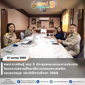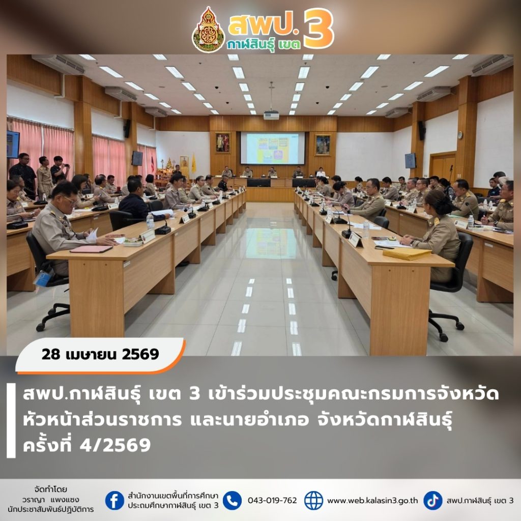 วันอังคารที่ 28 เมษายน 2569 เวลา 09.30 น. นายภมร หลอดแพง ผอ. สพป.กาฬสินธุ์ เขต 3 มอบหมายให้ นายมนตรี จันทวงศ์ รอง ผอ. สพป.กาฬสินธุ์ เขต 3 เข้าร่วมประชุมคณะกรมการจังหวัด หัวหน้าส่วนราชการ และนายอำเภอ จังหวัดกาฬสินธุ์ ครั้งที่ 4/2569 โดยมี นายสุวรรธณ์ เข็มธนเพ็ชร ผู้ว่าราชการจังหวัดกาฬสินธุ์ เป็นประธาน ณ ห้องโสมพะมิตร ชั้น 4 ศาลากลางจังหวัดกาฬสินธุ์ อำเภอเมืองกาฬสินธุ์ จังหวัดกาฬสินธุ์