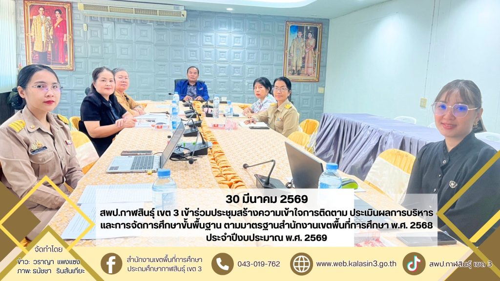 วันจันทร์ที่ 30 มีนาคม 2569 เวลา 09.00 น. นายชัยณรงค์ ฤทธิ์วงค์ รอง ผอ. สพป.กาฬสินธุ์ เขต 3 พร้อมด้วย ผอ.กลุ่ม/หน่วย และบุคลากรที่เกี่ยวข้อง เข้าร่วมประชุมสร้างความเข้าใจการติดตาม ประเมินผลการบริหารและการจัดการศึกษาขั้นพื้นฐาน ตามมาตรฐานสำนักงานเขตพื้นที่การศึกษา พ.ศ. 2568 ประจำปีงบประมาณ พ.ศ. 2569 โดยมี ดร.อรุณี จิรมหาศาล ผู้ช่วยเลขาธิการคณะกรรมการการศึกษาขั้นพื้นฐาน เป็นประธาน ณ ห้องประชุมเรืองปัญญา สพป.กาฬสินธุ์ เขต 3