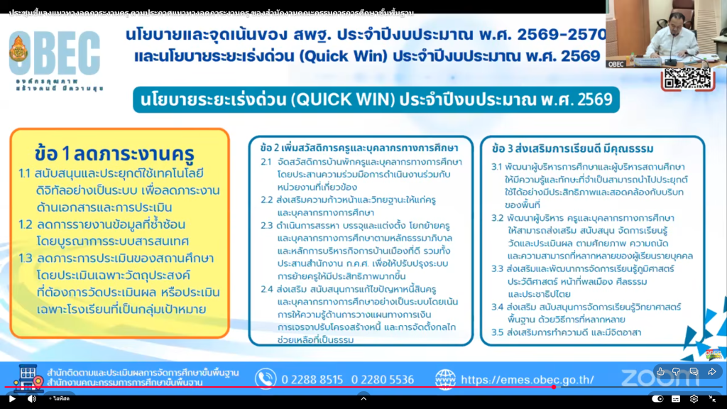 สรุปสาระสำคัญในการขับเคลื่อน (Quick Win 2569): สพฐ. กำหนดแนวทางลดภาระงานครูโดยมุ่งเน้น 3 ข้อหลัก เพื่อให้เกิดผลสัมฤทธิ์อย่างรวดเร็ว ได้แก่: