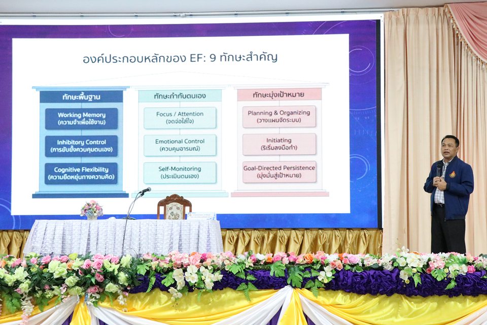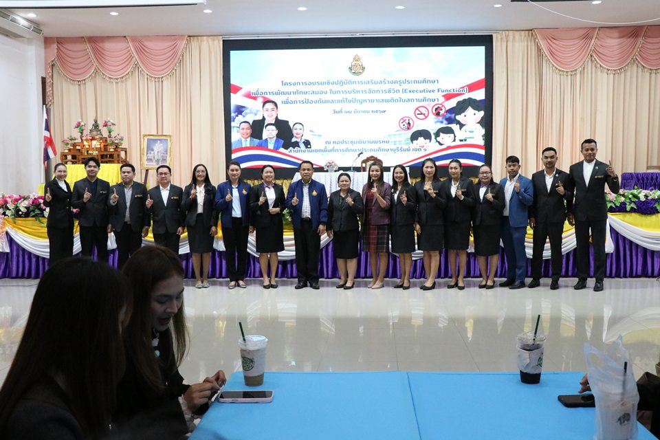 วันอังคารที่ ๑๗ มีนาคม ๒๕๖๙ นายอรรถพล ชาติรัมย์ รอง ผอ.สพป.บุรีรัมย์ เขต ๑ รักษาราชการแทน ผอ.สพป.บุรีรัมย์ เขต ๑ เป็นประธานเปิดพร้อมบรรยายพิเศษ โครงการเสริมสร้างศักยภาพครูประถมศึกษา เพื่อพัฒนาทักษะทางสมอง (EXECUTIVE FUNCTIONS : EF) ในการป้องกันและแก้ไขปัญหายาเสพติดในสถานศึกษาสำหรับเด็กปฐมวัย ณ หอประชุมพิมานพรหม สพป.บุรีรัมย์ เขต ๑ เพื่อสร้างการรับรู้ ความเข้าใจให้กับครูปฐมวัย เกี่ยวกับองค์ความรู้เพื่อพัฒนาทักษะทางสมอง ตลอดจนให้เกิดความตระหนักและเห็นความสำคัญในการส่งเสริมการพัฒนาทักษะทางสมองให้กับเด็กเพื่อเป็นเกราะป้องกันยาเสพติดให้กับเด็กในระยะยาว เสริมสร้างศักยภาพครูประถมศึกษาให้สามารถนำหลักการพัฒนาทางสมองโดยการบูรณาการและประยุกต์ใช้ การพัฒนาทักษะทางสมอง (EXECUTIVE FUNCTIONS : EF) ในแผนการจัดการเรียนรู้ให้สอดคล้องกับโลกยุคสมัยที่มีการเปลี่ยนแปลง และเพื่อเพิ่มองค์ความรู้ฐานราก ๓ มิติ การพัฒนามนุษย์ไว้เป็นฐานรากของการสร้างภูมิคุ้มกันยาเสพติดในทุกช่วงวัย ผู้เข้าอบรมประกอบด้วย ครูผู้สอนระดับประถมศึกษา ช่วงชั้นที่ ๑ จำนวน ๒๐๐ คน และคณะกรรมการดำเนินงาน จำนวน ๔๐ คน
