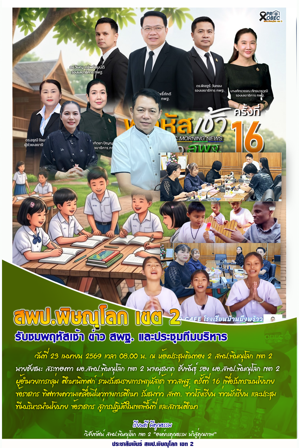 วันที่ 23 เมษายน 2569 เวลา 08.00 น. ณ ห้องประชุมดินทอง 2 สพป.พิษณุโลก เขต 2 นายชัยชนะ สระทองทา ผอ.สพป.พิษณุโลก เขต 2 นางนุชนาถ ชัยพันธุ์ รอง ผอ.สพป.พิษณุโลก เขต 2 ผู้อำนวยการกลุ่ม ศึกษานิเทศก์ ร่วมรับชมรายการ พฤหัสเช้า ข่าว สพฐ. ครั้งที่ 16 เพื่อรับทราบนโยบาย ข้อราชการ ทิศทางความเคลื่อนไหวทางการศึกษา รับชมข่าว สพท. ข่าวโรงเรียน ข่าวนักเรียน และประชุมทีมบริหารนำนโยบาย ข้อราชการ สู่การปฏิบัติในเขตพื้นที่ และสถานศึกษา