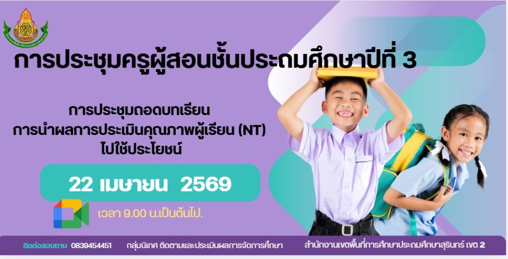 วันที่ 22 เมษายน 2569 สำนักงานเขตพื้นที่การศึกษาประถมศึกษาสุรินทร์ เขต 2 โดยกลุ่มนิเทศ ติดตาม และประเมินผลการจัดการศึกษา จัดการประชุมเชิงปฏิบัติการ “การวิเคราะห์ผลการประเมินคุณภาพผู้เรียน (NT) และการนำผลการประเมินไปใช้ในการพัฒนาผู้เรียน” สำหรับครูผู้สอนชั้นประถมศึกษาปีที่ 3 ผ่านระบบออนไลน์ Google Meet