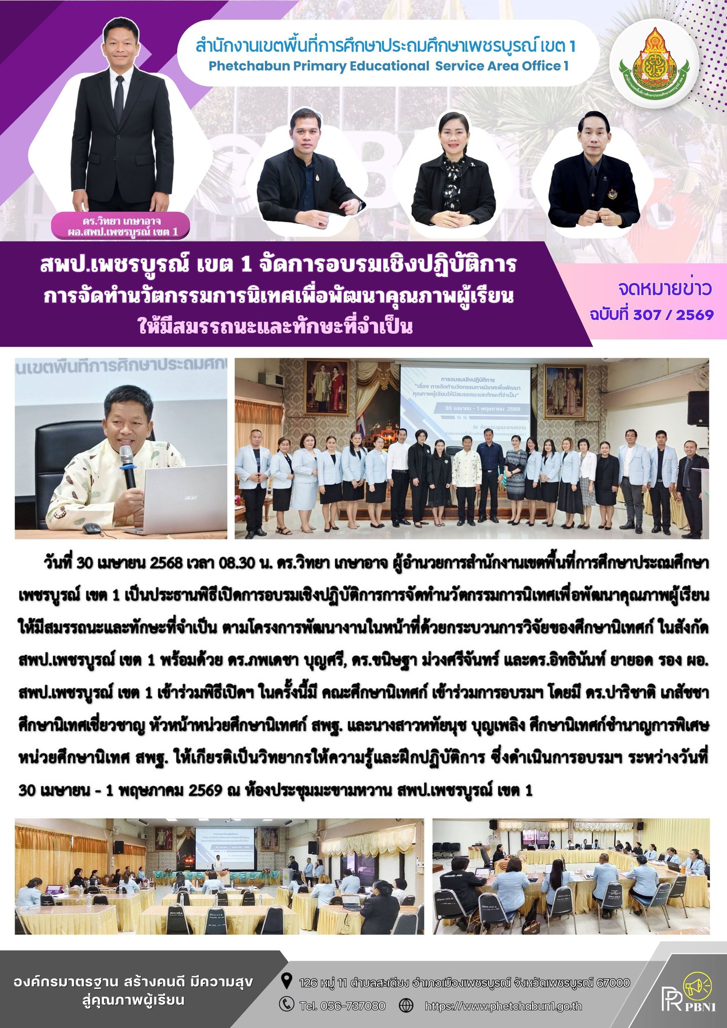 วันที่ 30 เมษายน 2568 เวลา 08.30 น. ดร.วิทยา เกษาอาจ ผู้อำนวยการสำนักงานเขตพื้นที่การศึกษาประถมศึกษาเพชรบูรณ์ เขต 1 เป็นประธานพิธีเปิดการอบรมเชิงปฏิบัติการการจัดทำนวัตกรรมการนิเทศเพื่อพัฒนาคุณภาพผู้เรียนให้มีสมรรถนะและทักษะที่จำเป็น ตามโครงการพัฒนางานในหน้าที่ด้วยกระบวนการวิจัยของศึกษานิเทศก์ในสังกัดสพป.เพชรบูรณ์ เขต 1 พร้อมด้วย ดร.ภพเดชา บุญศรี, ดร.ขนิษฐา ม่วงศรีจันทร์ และดร.อิทธินันท์ ยายอด รอง ผอ.สพป.เพชรบูรณ์ เขต 1 เข้าร่วมพิธีเปิดฯ ในครั้งนี้มี คณะศึกษานิเทศก์ เข้าร่วมการอบรมฯ โดยมี ดร.ปาริชาติ เภสัชชา ศึกษานิเทศเชี่ยวชาญ หัวหน้าหน่วยศึกษานิเทศก์ สพฐ. และนางสาวหทัยนุช บุญเพลิง ศึกษานิเทศก์ชำนาญการพิเศษ หน่วยศึกษานิเทศ สพฐ. ให้เกียรติเป็นวิทยากรให้ความรู้และฝึกปฏิบัติการ ซึ่งดำเนินการอบรมฯ ระหว่างวันที่ 30 เมษายน – 1 พฤษภาคม 2569 ณ ห้องประชุมมะขามหวาน สพป.เพชรบูรณ์ เขต 1