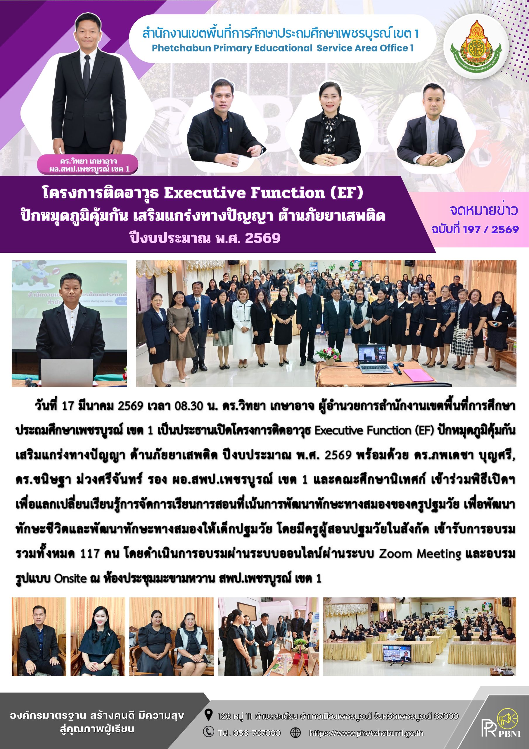 วันที่ 17 มีนาคม 2569 เวลา 08.30 น. ดร.วิทยา เกษาอาจ ผู้อำนวยการสำนักงานเขตพื้นที่การศึกษาประถมศึกษาเพชรบูรณ์ เขต 1 เป็นประธานเปิดโครงการติดอาวุธ Executive Function (EF) ปักหมุดภูมิคุ้มกัน เสริมแกร่งทางปัญญา ต้านภัยยาเสพติด ปีงบประมาณ พ.ศ. 2569 พร้อมด้วย ดร.ภพเดชา บุญศรี, ดร.ขนิษฐา ม่วงศรีจันทร์ รอง ผอ.สพป.เพชรบูรณ์ เขต 1 และคณะศึกษานิเทศก์ เข้าร่วมพิธีเปิดฯ เพื่อแลกเปลี่ยนเรียนรู้การจัดการเรียนการสอนที่เน้นการพัฒนาทักษะทางสมองของครูปฐมวัย เพื่อพัฒนาทักษะชีวิตและพัฒนาทักษะทางสมองให้เด็กปฐมวัย โดยมีครูผู้สอนปฐมวัยในสังกัด เข้ารับการอบรม รวมทั้งหมด 117 คน โดยดำเนินการอบรมผ่านระบบออนไลน์ Zoom Meeting และอบรมรูปแบบ Onsite ณ ห้องประชุมมะขามหวาน สพป.เพชรบูรณ์ เขต 1