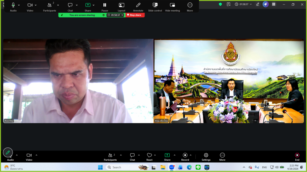 วันที่ 28 เมษายน 2569 เวลา 13.30 น. สำนักงานเขตพื้นที่การศึกษามัธยมศึกษาเชียงใหม่ ประเมินสัมฤทธิผลการปฏิบัติงานในหน้าที่เพื่อพัฒนาการศึกษา เป็นระยะเวลา 1 ปี (ครั้งที่ 1) ของ นายสัจจกรญ์ กันปนก ตำแหน่ง รองผู้อำนวยการสถานศึกษา โรงเรียนแม่แจ่ม ผ่านสื่ออิเล็กทรอนิกส์ ระบบ ZOOM Meeting ณ ห้องประชุม 1 ชั้น 4 สำนักงานเขตพื้นที่การศึกษามัธยมศึกษาเชียงใหม่