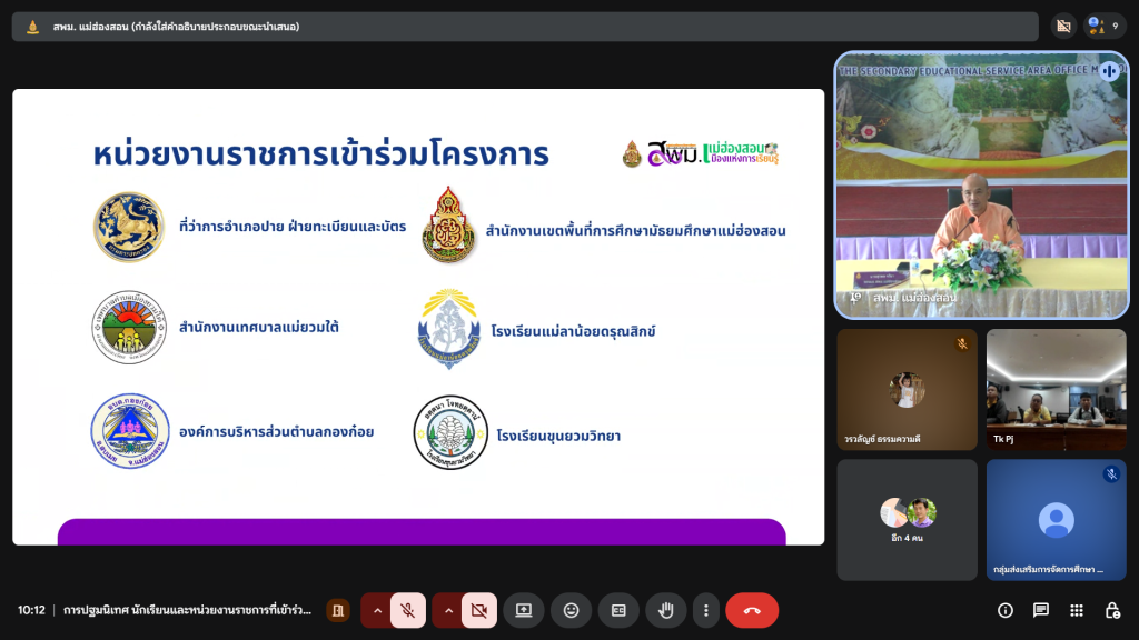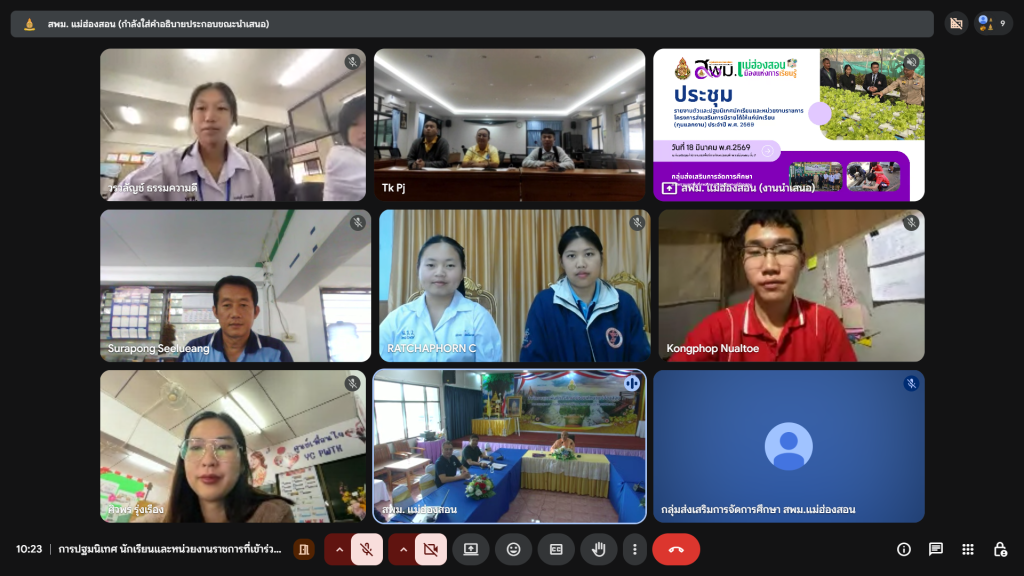 วันที่ 18 มีนาคม 2569 เวลา 10.00 น. สำนักงานเขตพื้นที่การศึกษามัธยมศึกษาแม่ฮ่องสอน จัดประชุมปฐมนิเทศนักเรียนที่เข้าร่วมโครงการส่งเสริมการมีรายได้ให้แก่นักเรียน (ทุนแลกงาน) ประจำปีงบประมาณ พ.ศ.2569 ผ่านระบบออนไลน์ Google Meet โดย นายธีรภัทร วงษ์สว่าง ผู้อำนวยการสำนักงานเขตพื้นที่การศึกษามัธยมศึกษาแม่ฮ่องสอน มอบหมายให้ นายสุรพล จริยา รองผู้อำนวยการสำนักงานเขตพื้นที่การศึกษามัธยมศึกษาแม่ฮ่องสอน เป็นประธานในการปฐมนิเทศ พร้อมทั้งมอบโอวาทแก่นักเรียนที่ได้รับคัดเลือกเข้าร่วมโครงการ ณ ห้องประชุม ชั้น 2 สำนักงานเขตพื้นที่การศึกษามัธยมศึกษาแม่ฮ่องสอน ตำบลจองคำ อำเภอเมืองแม่ฮ่องสอน จังหวัดแม่ฮ่องสอน