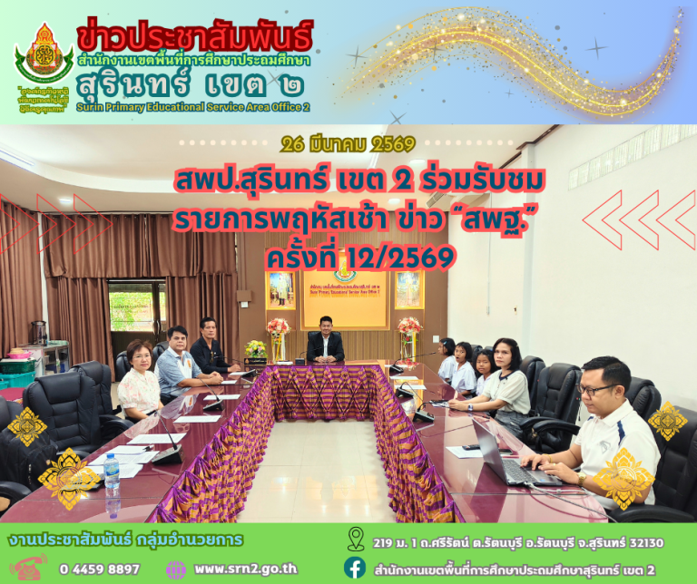 วันที่ 27 มีนาคม 2569 – สำนักงานเขตพื้นที่การศึกษาประถมศึกษาสุรินทร์ เขต 2 (สพป.สุรินทร์ เขต 2) จัดการประชุมผู้บริหารสถานศึกษาและบุคลากร ครั้งที่ 3/2569 ณ ห้องประชุมเมืองแก้ว โดยมี นายสิทธิพร ผมงาม ผู้อำนวยการ สพป.สุรินทร์ เขต 2 เป็นประธานเปิดการประชุม เพื่อมอบนโยบายและติดตามความก้าวหน้าในการจัดการศึกษา มุ่งเน้นการนำเทคโนโลยีมาประยุกต์ใช้ ควบคู่ไปกับการดูแลขวัญกำลังใจของบุคลากรช่วงเช้า : อัปสกิลผู