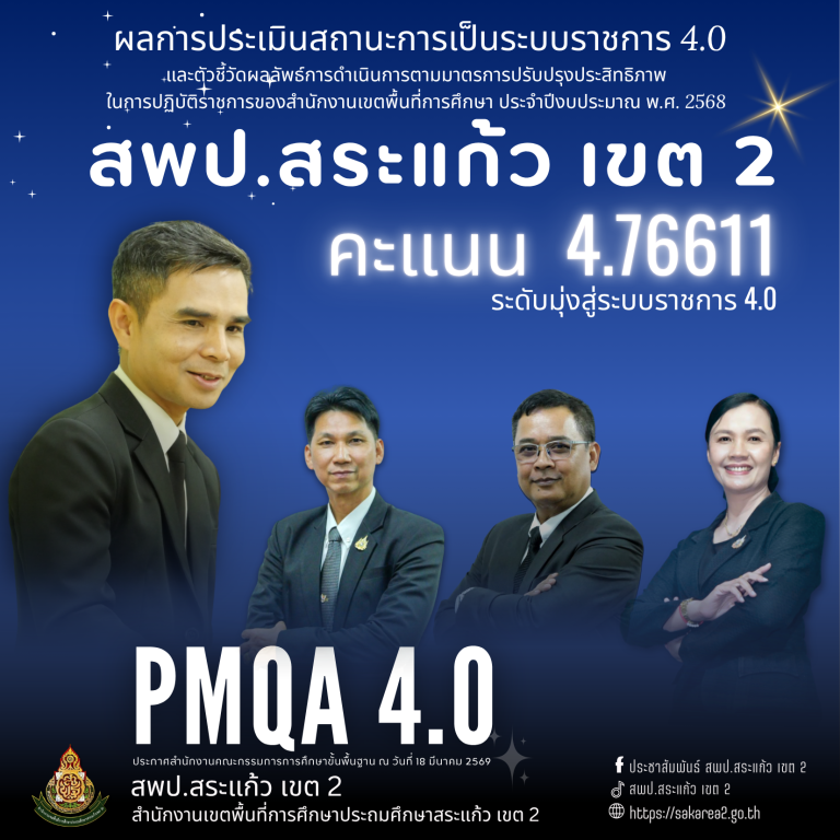 วันพฤหัสบดีที่ 2 เมษายน 2569 นายสมคิด แตงพรม ผู้อำนวยการสำนักงานเขตพื้นที่การศึกษาประถมศึกษาสระแก้ว เขต 2 มอบหมายให้นางจิราวัฒน์ คุณเวียน รองผู้อำนวยการสำนักงานเขตพื้นที่การศึกษาประถมศึกษาสระแก้ว เขต 2 พร้อมด้วยข้